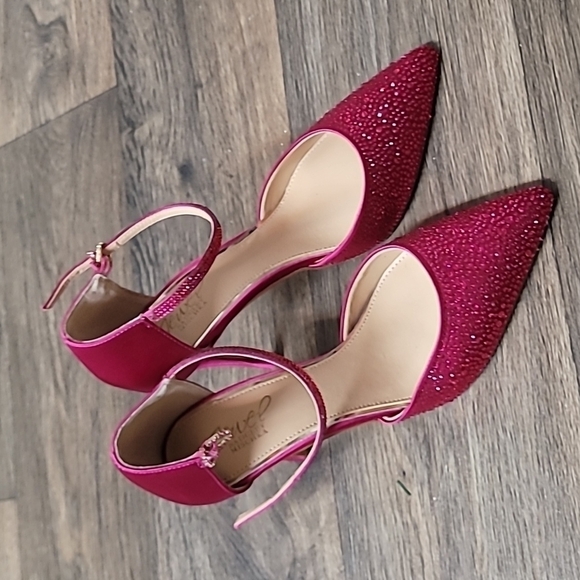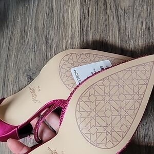 Jewel by Badgley Mischka pink satin high heel shoe. Pointy toe with crystal. Ankle strap.