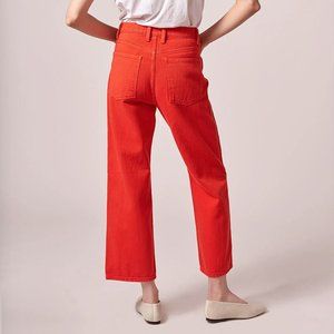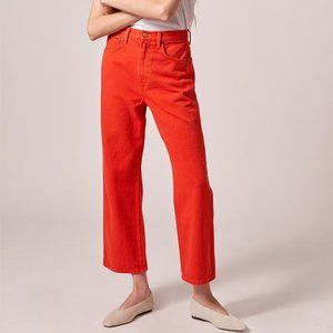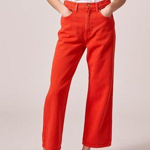 Plein Relaxed Straight overdyed to a brilliant geranium red. A modern jean cut from vintage wt. denim with a broken twill weave that will soften over time. Designed to sit at the natural high waist and fall into a super straight, relaxed, leg shape. A silhouette with some ease, wear cuffed or straight.