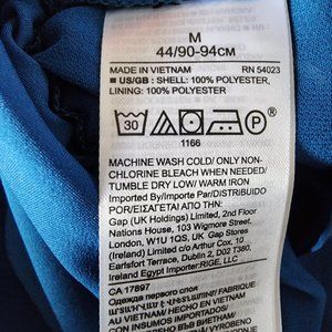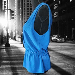 Banana Republic Double Vee Faux Wrap Peplum Silky Shirt/Blouse/Tank. The fabric type is a silky georgette made of 100% polyester. Vee neck, Wide Shoulder Strap, Lining and solid pattern. Color is Shibori Blue. Use for business, casual. Very beautiful color. Measures 20" across the bust and length from top of shoulder to hem is 24" and if measuring from the waist to hem it is 7".