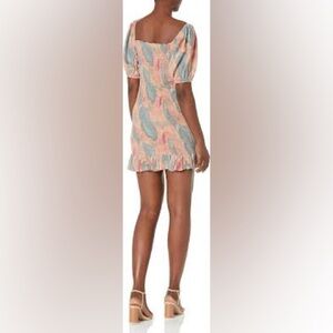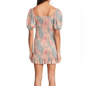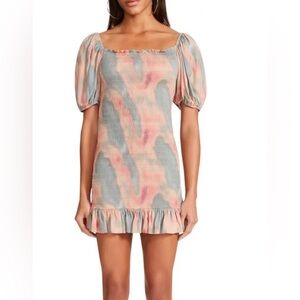 The Ode To You Dress is a tie-dye rayon, voile-smocked mini. It has puff sleeves and a ruffle at the hem.
