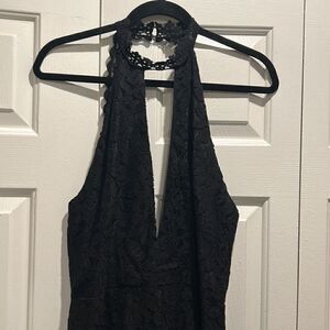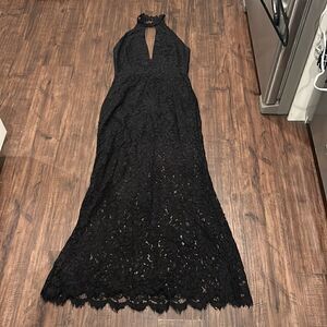 NWT BB Dakota RSVP Black Lace Halter Gown, Size 8. Dress is lined to the knee and then sheer down to the hemline. Deep V halter neckline.