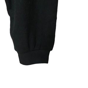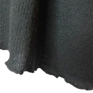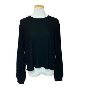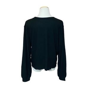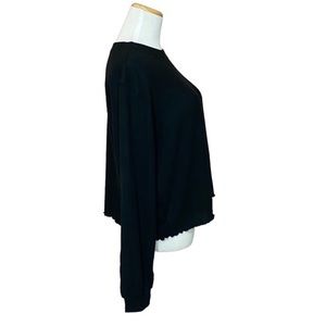 Details: SCARF NOT INCLUDED Beautiful black ribbed sweater, pullover, crew neck, long full sleeves with cuff, lettuce edge hemline, soft stretchy fabric.