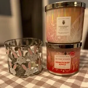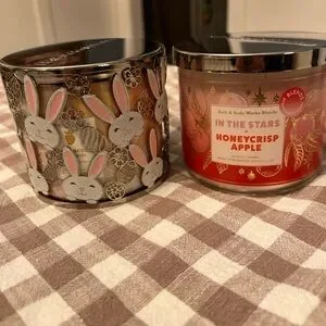 NWT, BBW CANDLE BUNDLE, TWO 3 WICK CANDLES AND EASTER BUNNY 3 WICK CANDLE HOLDER