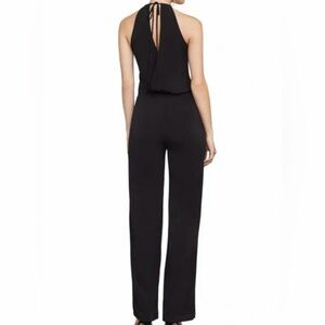 This BCBG black jumpsuit features a chic halter-style top and a wide-leg silhouette, perfect for formal or business occasions. Crafted from structured fabrics, it offers a modern and sophisticated look with clean lines and a classic design.