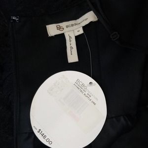 BCBGeneration dress. Spaghetti straps. Heart neckline with one side fringed. Layered look with ruffles. Black shimmer color. Back closure is hidden zipper and hook and eye.