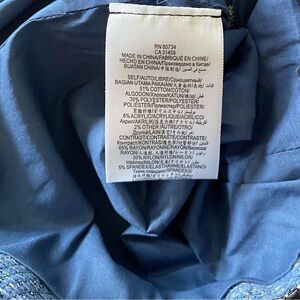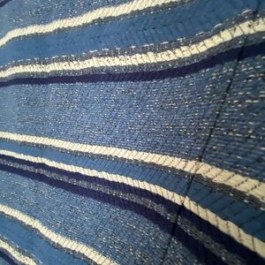 This moto jacket is GORGEOUS! Perfect to throw on for any occasion this season! It has a silver shimmer thread to it, with cool stripes of white blue and black. Can zip all the way up if you un-snap the flaps. Really cool asymmetrical piece to add to your closet!