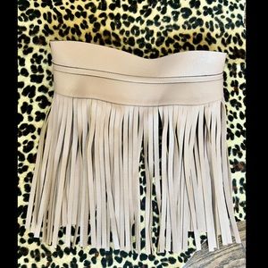 NWT BCBG Max Azria Leather Fringe Waist Belt size Small in a nude blush pink tone. Never worn. Total length is 32” and 16” wide from top of belt to bottom of fringe, waist band 4” wide. Belt has 5 holes 1” apart - 26” at the smallest hole and 30” at the largest. Super fun belt to wear over shorts, skirt, with a dress or over a bathing suit for a strong look. Great for fest season, an addition to a cowgirl bachelorette or just because 🤠. Originally purchased here in Chicago a few years ago and has been kept in a clean, dry home.