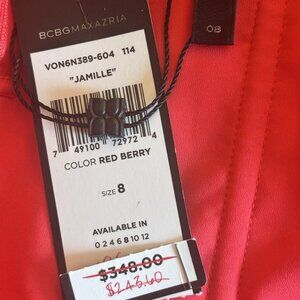 This is a NWT one shoulder Jamille one shoulder maxi dress in the color Red Berry from BCBG Maxazria, size 8. This beautiful dress is lined and zips in the back. Pleating across the bodice.