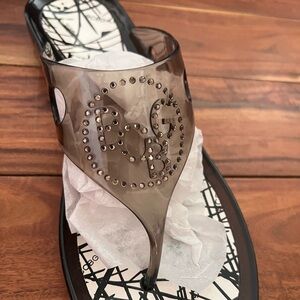 Smoky black jelly material with rhinestone logo, flip flop style.
