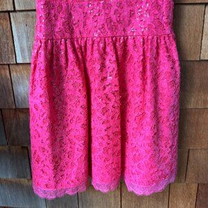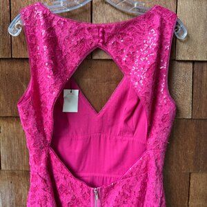 Brand new with tags! Bold Pink BCBGMAXAZRIA Katarina Lace Sequin V-Neck Open Back Dress in Women's 12 - This chic, Glamorous, sexy BCBGMaxAzria Katarina bright pink lace sequin sleeveless V-neck fit and flare dress with a cutout in the back is the right choice for your special night out. Belt shown in photos is not included