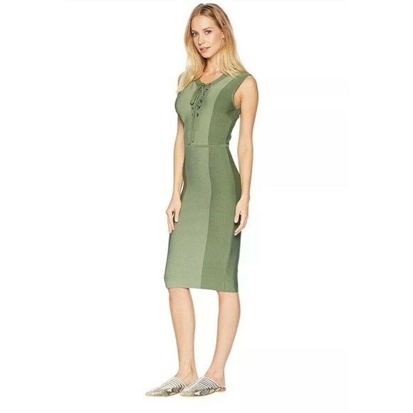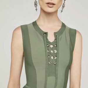 This sleeveless knit dress from BCBGMAXAZRIA contours your body in colorblocked safari stripes and features a sexy lace-up neckline.