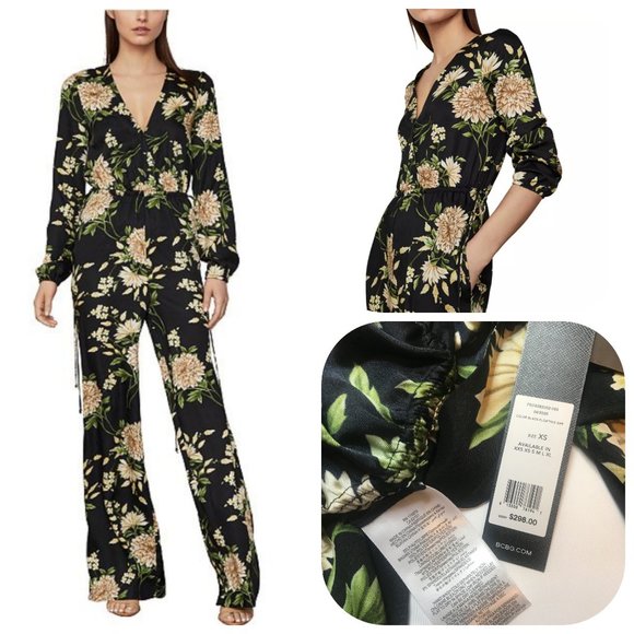 BCBGMAXAZRIA Women's Long Sleeve V-Neck Jumpsuit Size XS. $298. The perfect one-step outfit. This long-sleeve jumpsuit from BCBGMAXAZRIA features a surplice bodice with a cinched waist that ties for the perfect fit and falls to a wide leg. inseam: 32", model height is 5'11" and she is wearing a size XS, Front rise: 13-1/4"; back rise:17-1/2";-Cinched tie at waist
