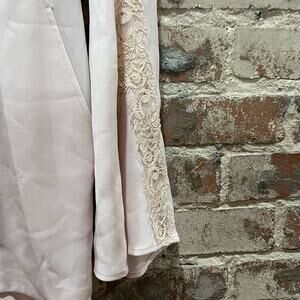Features side pockets and back zipper.  Unlined. Round neckline.  Slight stretch to material. Bell sleeves with lace accent.