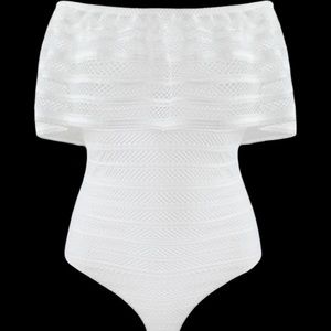 Striped lace knit defines this romantic one-piece, with a ruffled off-shoulder overlay and a snap button closure at the gusset.