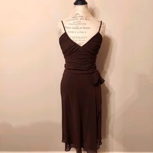 This dark brown dress features pleating around the bodice, adjustable spaghetti straps, and a self tie at the waist. The fabric is a silk chiffon and the dress is fully lined. The dress has a side zipper. The dress is a size small with bust of 35.5 inches, waist measurement 28 inches and hip measurement of 37.5 inches.