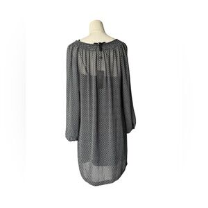 This relaxed-fit tunic dress features a black and white mini geometric print with a flattering flowy silhouette. The neckline has a tie-front detail with tassels, adding a touch of boho charm. With long sleeves gathered at the cuffs and lightweight fabric, it can be worn as a dress or styled as a long blouse over leggings