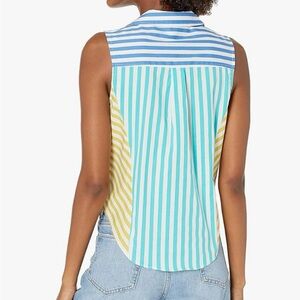 Chic sleeveless button-down with vibrant stripes. Features a stylish tie-front. Perfect for sunny days.