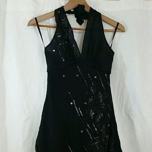 NWT! BCBGMaxAzria beaded sequin halter dress. Size 0. Beautiful black silk dress with floral beading and sequin on chest, body and back. Comes with extra beads and sequins. Asymmetrical hemline. Fully lined. Tie at neck halter top with side zip. Beautiful dress for any occasion!