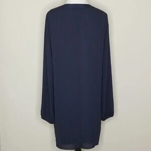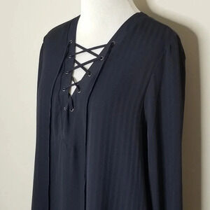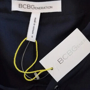New with Tags BCBGeneration dark blue dress with tonal dark blue stripes. Crisscross neckline with ties. Pull over styling. Elasticized wrists.