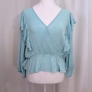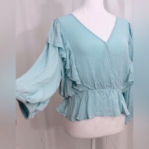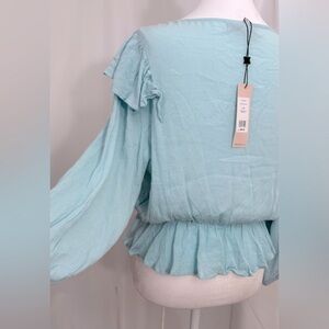NWT BCBGeneration Cropped Ruffled Flowy Peplum Top With Long Peasant Sleeves Snd Elastic Waist In Artic Blue Color Size Medium