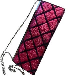 NWT Sassy & Classy black/fuschia pink colored enveloped shaped clutch with a beautiful shiny diamond patterned print. Metal chain attached, black cloth interior featuring one pocket inside and a magnetic closure.