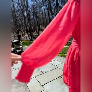 belted waist, tiered ruffle design, sheer bubble sleeves sorry picture is blurry.