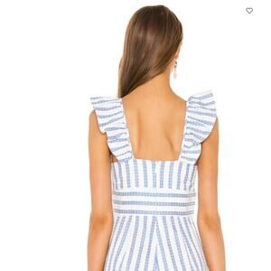 Gorgeous New Blue and White BCBGeneration Ruffled Strap Cropped Jumpsuit. Striped jumpsuit is crafted from a linen stripe, lightweight wear. Sweetheart neckline with tie detail at center bust. Flutter trim highlights the elastic shoulder straps. Ruffled straps, front knot tie, and cropped leg accentuate this printed jumpsuit.