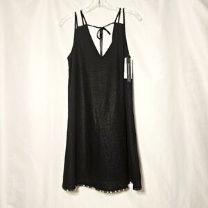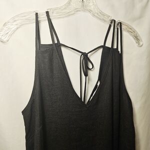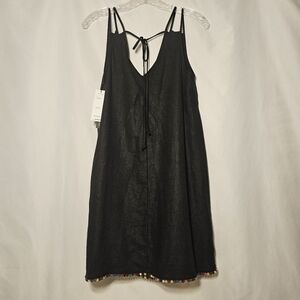 NWT | BCBGeneration | Womens casual Black Linen Blend (52% linen/48% rayon) Sleeveless double Strap Shoulders Top | tie back detail | delicate beaded trim at hemline in multi-colored earth-tones | Size S