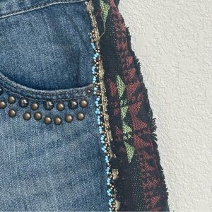 Features bronze-tone studs at the front pockets, raw hem, and a unique multicolor woven and beaded side panel.