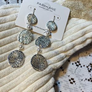 • White Silver Finish • Glass Pearls • Sleek Statements • Sand Dollar like Design • 4 ¼” Long