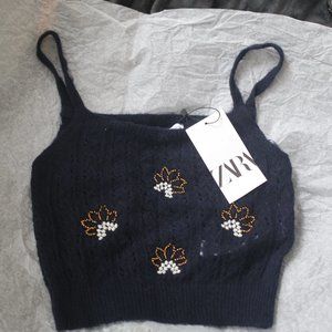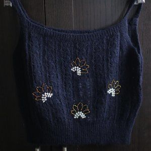 NWT BEADED EMBROIDERED WOOL BLEND KNIT NAVY TOP.