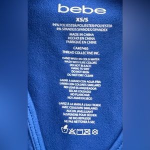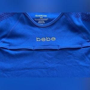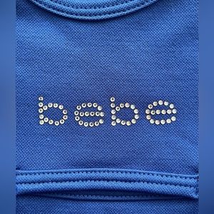 NEW WITH TAG! BEBE Swarovski crystal logo, stretch knit tee, in a size XS/S. Semi cropped. Features mesh at the shoulders, and 3 slits at the bust-line. Comprised of 94% polyester, 6% spandex, so lots of stretch. Measurements are approximate: