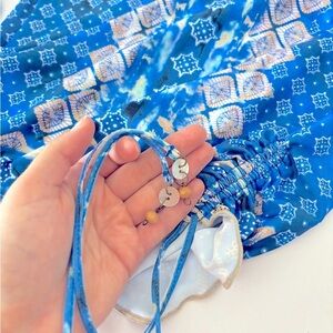 Vibrant blue bikini set by BECCA. Features intricate patterns and adjustable side ties.