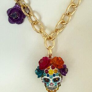 NWT Betsey Johnson Sugar Skull Rhinestone Halloween Day of the Dead Necklace is a stylish and festive accessory perfect for the Halloween season.