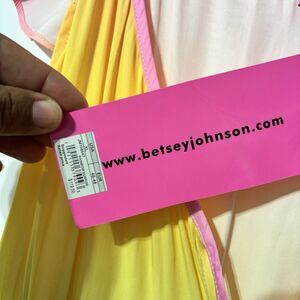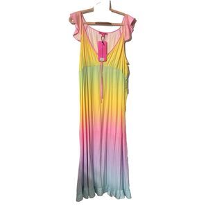 This NWT Betsey Johnson Rainbow Sunrise Ombré Dress in XLarge is perfect for a wedding or party. The dress features a pink color with ruffle accents, long length, and a fit & flare style. The maxi dress with a blouson and bodycon silhouette is ideal for a summer or spring occasion, and showcases the brand's signature vibrant and stylish designs. Perfect for celebrating a special event in style.