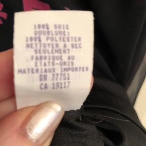 Stunning ballet motif print dress in shades of pinks and purples with a bit of blue on black background. Silk chiffon overlay ending in slight lettuce-edge hem. Attached polyester under slip. Slip ends approx. five inches from bottom of dress. Elastic going around top and bottom of empire-styled waist which has chiffon tie. The dress is fairly straight and not best suited for curvy figure. Pit to pit 11 1/2 in laying down. Hip approx. 16 in laying down. Approx, 43 in. from top of dress to hem. Best for xs or xxs.