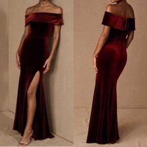 Part of a special collection from BHLDN. This lush velvet off-the-shoulder dress evokes Old Hollywood glamour, with a subtly flared skirt that features a deep front slit.
