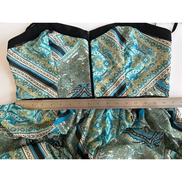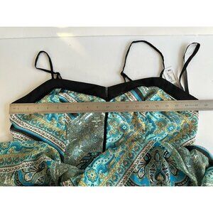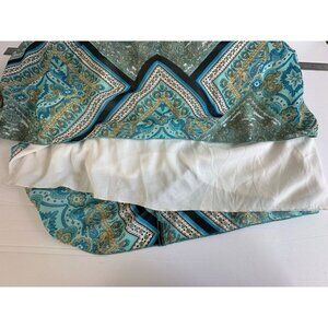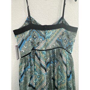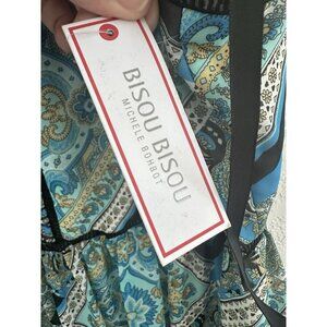 NWT BISOU BISOU Michele Bohbot Teal Scarf Tile Print Black Trim Maxi Dress 14