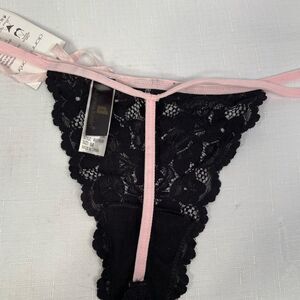 NWT BLACK LACE WITH PINK SATIN V-STRING BY DONNA L’OREN SIZE MEDIUM