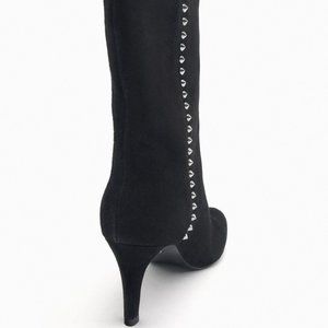 Suede heeled ankle boots. Side metal studs detail. Pointed toe.
