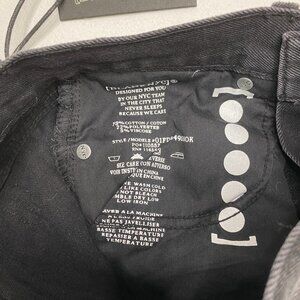 Black wash denim with intentional fading, whiskering & distressing