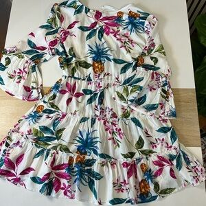 Charming Blue Island swimsuit cover-up with tropical floral design. The bell sleeves add a touch of elegance. Definitely an eye catcher!