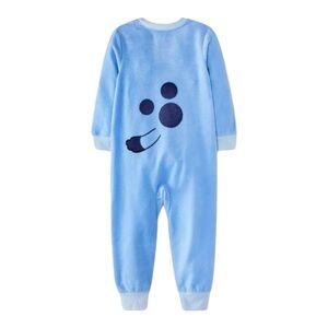 Add cartoon-inspired fun to your kid's bedtime or day with the Bluey Blanket Sleeper with Hat. This blue blanket sleeper showcases a blue onesie with a hat that features Bluey face and ears for a cute look. It includes ribbed cuffs and hem for a snug fit and extra warmth. Tailored from soft fabric, this lightweight blanket sleeper helps keep them comfortable, and its front half-length zipper allows easy dressing and changing.