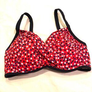 This bikini swim top is not only chic with its hot red & black polka-dot print and twist-front ruched detail, but its also shape enhancing with your specific cup size and very supportive with underwire and padded moulded fixed cups....