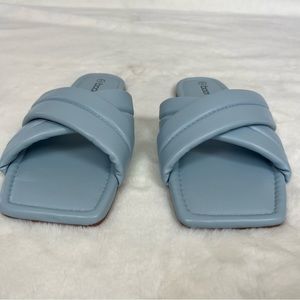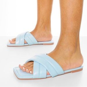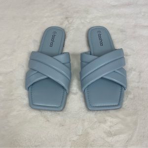 Boohoo wide width padded cross cross strap slide sandals. Size 6. In pastel blue. New, never worn. Originally $40.