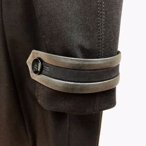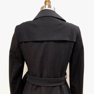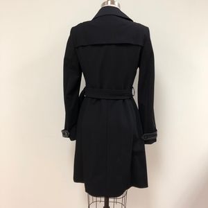 NWT BOSS/HUGO BOSS, womens black trench coat with black leather trim detail on cuffs, buckle and front of coat, heavy twill cotton/polyamide/elastane, partially lined, button front, perfect condition! Never worn, tags attached, Bust measures 36", US sz 4