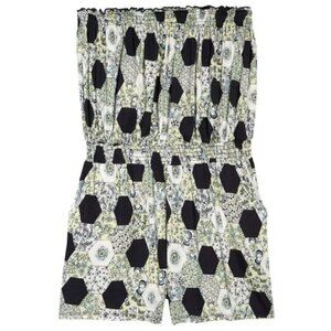Sweet and summery, this airy strapless romper is styled in a flowery geo print and cinched with a defining smocked waist.