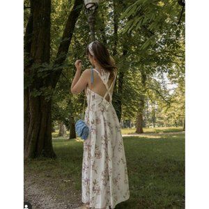 Brock Collection x H&M. Calf-length long cream floral dress in woven fabric made from a Tencel lyocell and linen blend with a printed pattern. Fitted, double-layered upper section with shaping seams, relaxing at waist. Wide shoulder straps crossed at back and adjustable at back with concealed buttons. Low-cut neckline, concealed zipper at back with hook-and-eye fastener, and an unlined skirt. New with tags in US size XLarge. SOLD OUT EVERYWHERE!