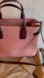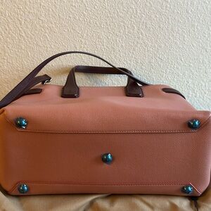 The interior is lined with checked canvas and has ample space for all your essentials. The bag is spacious in size and has a rectangular shape. The leather handle and strap are a beautiful pink and maroon brown color that adds a pop of color to the overall design. The strap is detachable.
