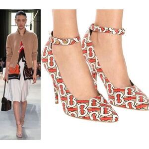 Squeeze the day in these tawny orange calf leather TB monogram logomania print Runway pumps from Burberry. The uber-chic pair features an ankle strap with a side buckle fastening, a pointed toe, a high heel, a branded insole and stud embellishment to ankle strap, they're sweeter than an easy peeler. Make heads turn in these unique Burberry ankle-strap pumps.